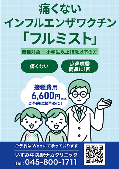 昨年に引き続き、今年も痛みの無いインフルエンザワクチン「フルミスト」もご用意しております。